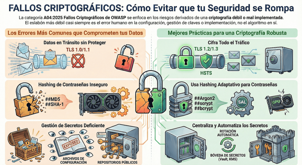 Con la llegada de OWASP Top 10 – 2025, la categoría A04: Cryptographic Failures mantiene un lugar dominante dentro de los primeros puestos. El ascenso o estabilización en este nivel refleja que, pese a que la industria avanzó hacia arquitecturas más seguras, la criptografía sigue siendo un área donde los errores de implementación tienen consecuencias catastróficas. En 2025, los principales vectores de ataque ya no giran tanto en torno a algoritmos rotos —porque la mayoría fueron eliminados— sino a configuraciones incorrectas, validaciones defectuosas, generación de claves inapropiada, mal manejo del ciclo de vida de claves, errores en hardware security modules, mala integración de TLS en microservicios, exposición accidental de claves privadas en repositorios públicos y fallos en la criptografía aplicada a contenedores, almacenamiento cloud y pipelines CI/CD. La complejidad del software moderno aumentó la dependencia en criptografía, pero no necesariamente mejoró la competencia en su uso.