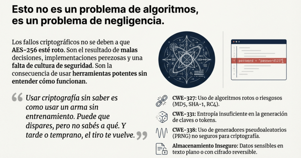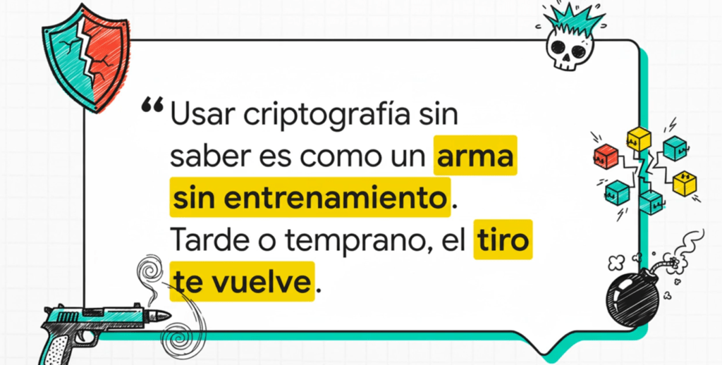 En resumen, los fallos criptográficos no son un “problema técnico”. Son el síntoma de una falta de cultura de seguridad. Usar criptografía sin saber es como usar un arma sin entrenamiento. Puede que dispares, pero no sabés a qué. Y tarde o temprano, el tiro te vuelve.