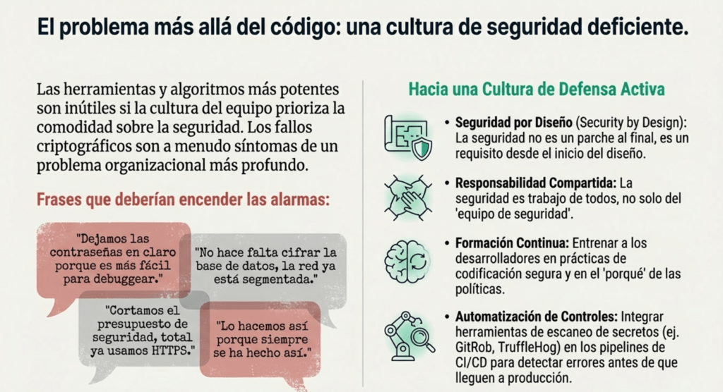 Pero el problema va más allá del código. Es cultural. Hay equipos que siguen usando contraseñas en claro porque “es más fácil para debuggear”. También Hay arquitectos que definen que no hace falta cifrar porque “la red está segmentada”. Hay managers que cortan presupuesto de seguridad porque “ya usamos HTTPS”. Y después, cuando explota, nadie sabe cómo, pero todos sabían que podía pasar.