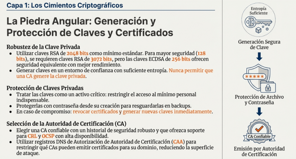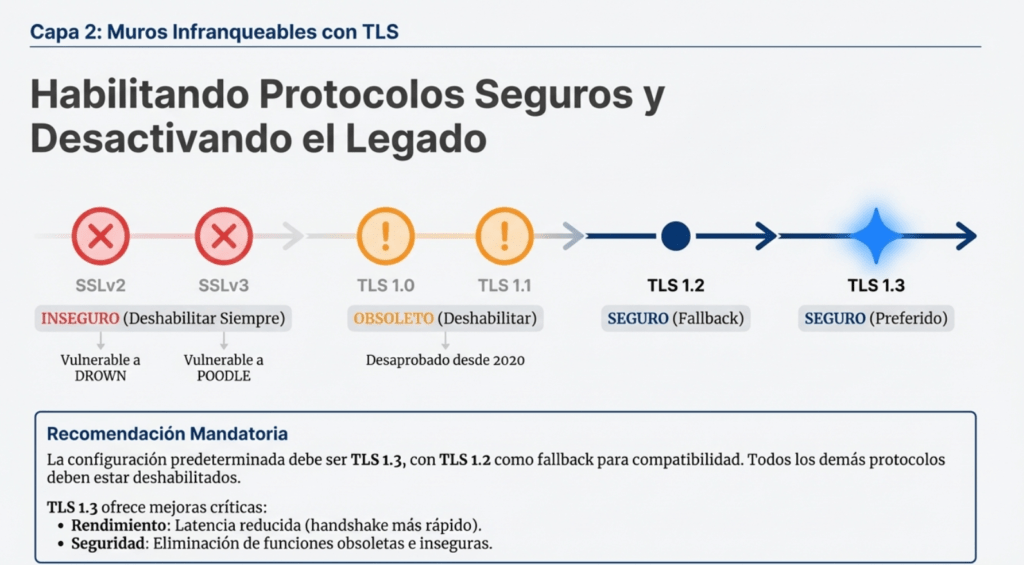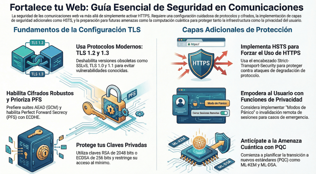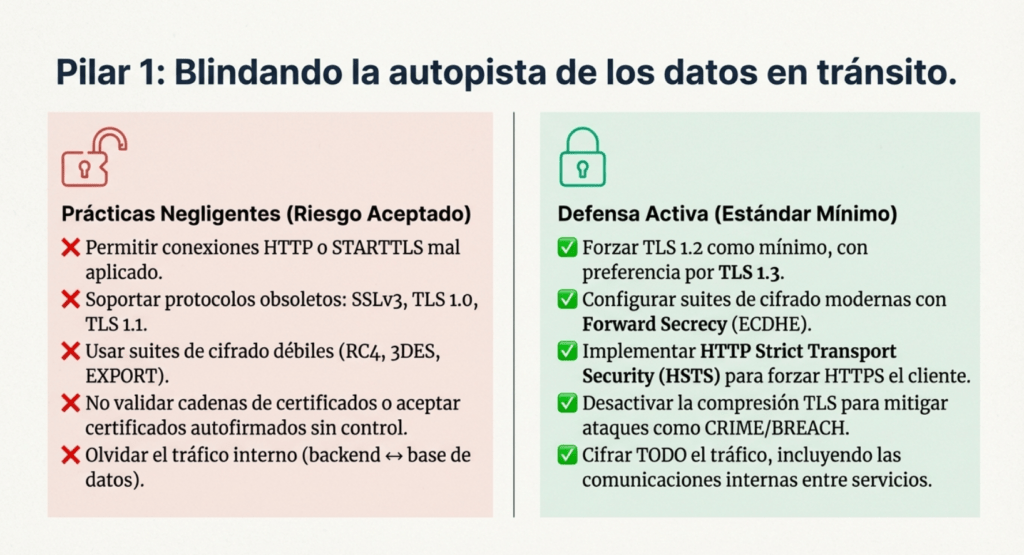 • TLS 1.2+ obligatorio, preferible TLS 1.3.