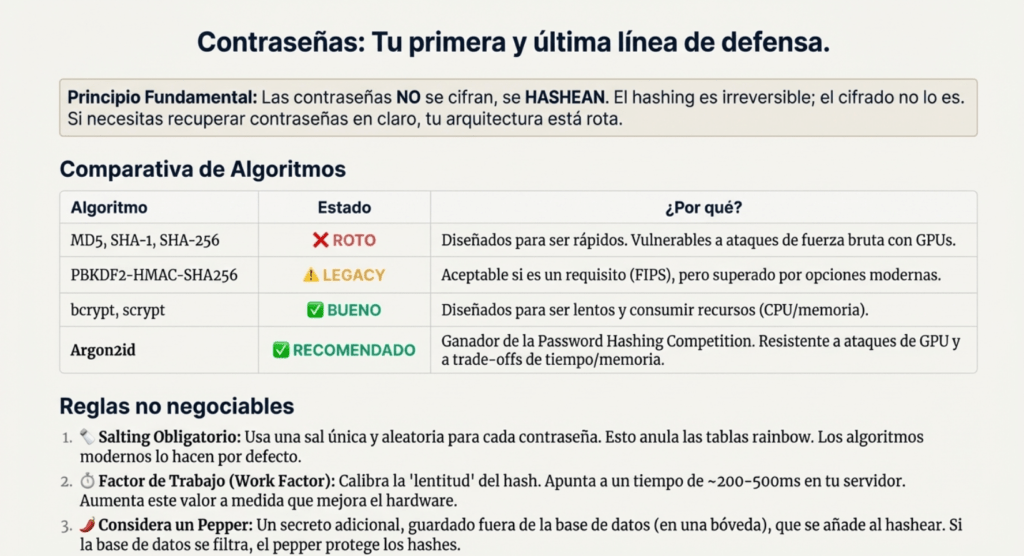 • Almacene contraseñas utilizando funciones de hash adaptativas y con sal robustas con un factor de trabajo (factor de retardo), como Argon2, scrypt, bcrypt (sistemas antiguos) o PBKDF2-HMAC-SHA-256. Para sistemas antiguos que utilizan bcrypt, consulte la Hoja de referencia de OWASP: Almacenamiento de contraseñas.
