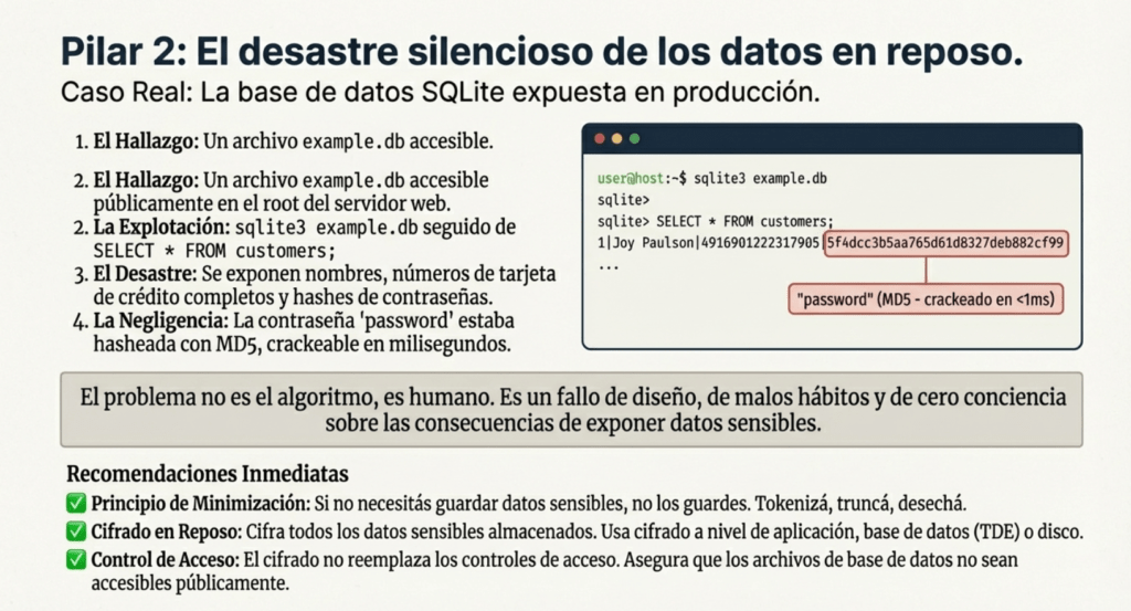 Falta de cifrado en reposoDatos plaintextDB de tarjetas sin cifrarRevisar storageAcceso directo a DBFuga masivaAES256 en reposoPreguntas sobre “at rest”