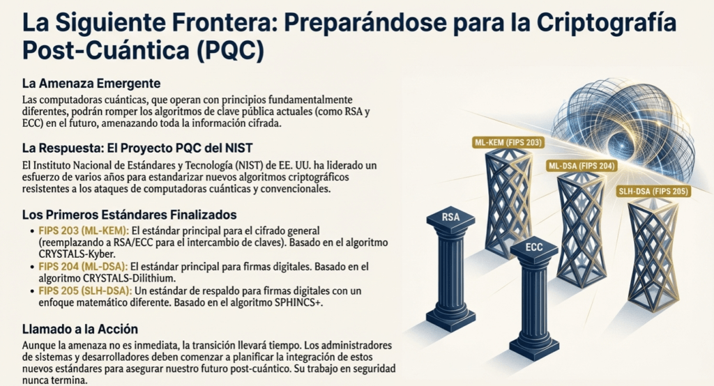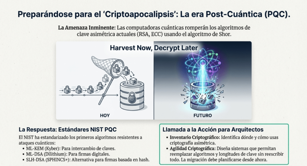 Y sí, pensá en la postcuántica. Hoy no es urgente, pero lo va a ser. Los algoritmos que usamos hoy para firmas y clave pública no van a aguantar una computadora cuántica decente. El NIST ya publicó estándares postcuánticos como Kyber, Dilithium y Sphincs+. Si estás diseñando para largo plazo, pensá en cómo vas a migrar.