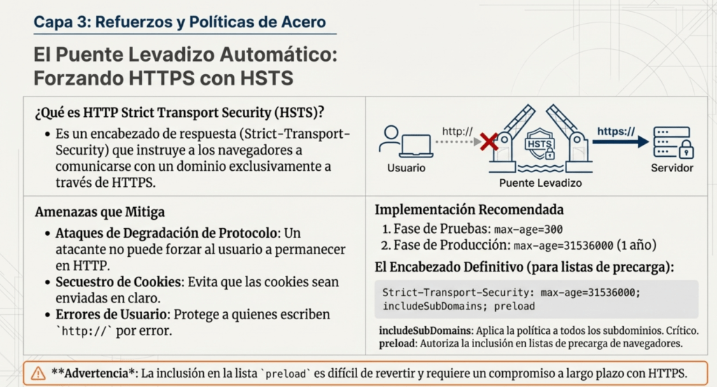 • Cifre todos los datos en tránsito con protocolos seguros como TLS con cifrados de confidencialidad directa (FS), priorización de cifrado por parte del servidor y parámetros seguros. Aplique el cifrado mediante directivas como la Seguridad de Transporte Estricta HTTP (HSTS).