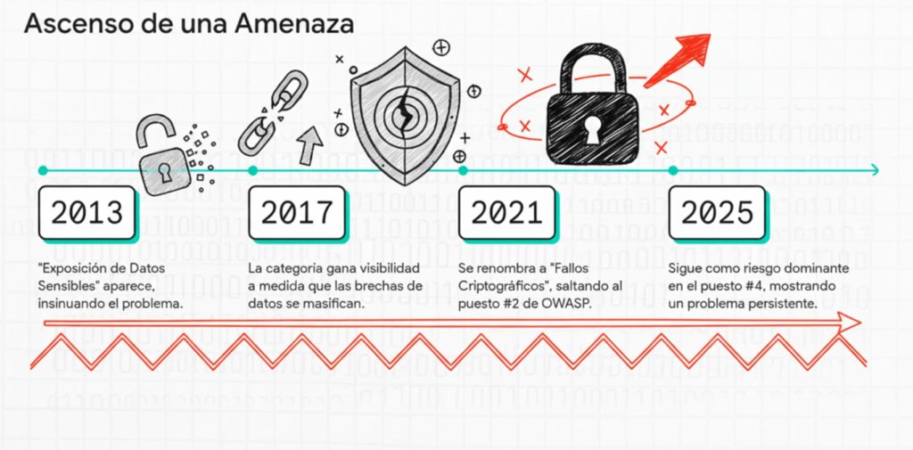 En los primeros años del OWASP Top 10 (2003, 2004, 2007 y 2010), los fallos criptográficos existían, pero estaban dispersos en categorías más amplias como “Sensitive Data Exposure”, “Insecure Storage” o “Cryptographic Storage Failures”. La percepción dominante era que la criptografía era un área relativamente controlada: la mayoría de los desarrolladores simplemente reutilizaban las funciones criptográficas provistas por sus frameworks, y se asumía que eso era suficiente para proteger datos sensibles. Sin embargo, estos primeros rankings mostraban señales claras de un problema subyacente: cifrado débil, uso de algoritmos obsoletos, claves demasiado cortas, almacenamiento inseguro de credenciales, falta de salts en hashes de contraseñas y configuraciones iniciales incorrectas en TLS/SSL. En ese momento, la categoría no ocupaba posiciones altas, pero OWASP ya advertía que los desarrolladores cometían errores sistemáticos al implementar o configurar criptografía.