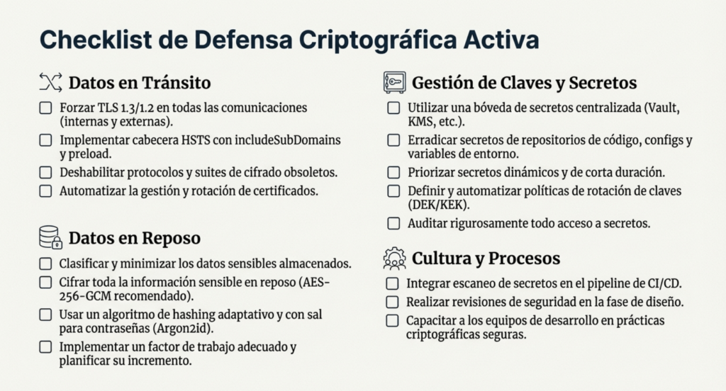 • Revisiones y pruebas automáticas de criptografía en CI/CD.