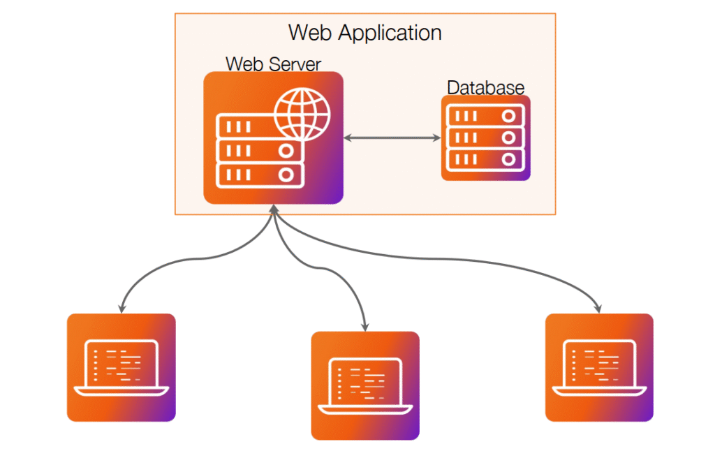 La imagen representa la estructura fundamental de una aplicación web, mostrando cómo se comunican sus distintos componentes principales: los usuarios, el servidor web y la base de datos. En la parte superior se encuentra la Web Application, compuesta por dos elementos esenciales: