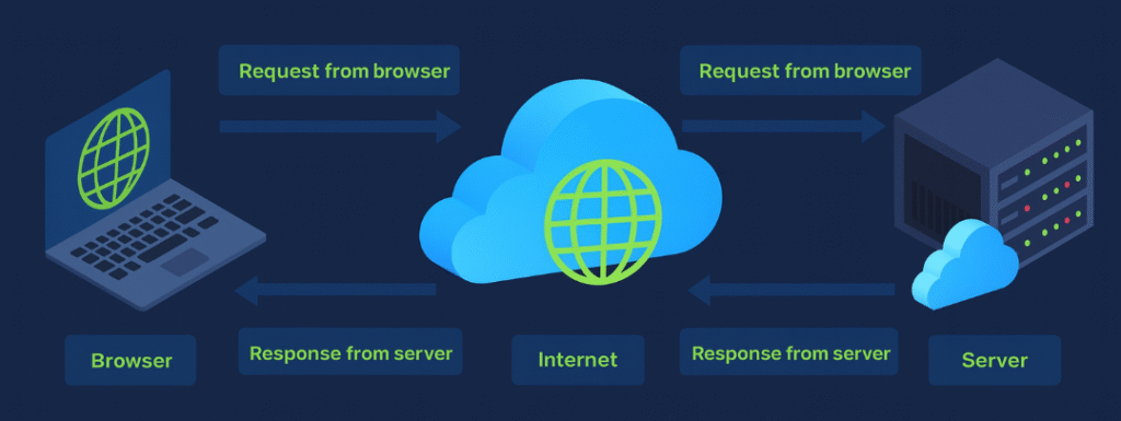 La imagen ilustra el proceso de comunicación entre un navegador (cliente) y un servidor web, mostrando cómo viajan las solicitudes y respuestas a través de Internet. Este intercambio es la base de toda interacción en la web.