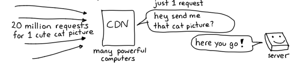 La CDN (Content Delivery Network) almacena en caché los recursos estáticos (imágenes, archivos JS, CSS, etc.) en servidores distribuidos globalmente.
