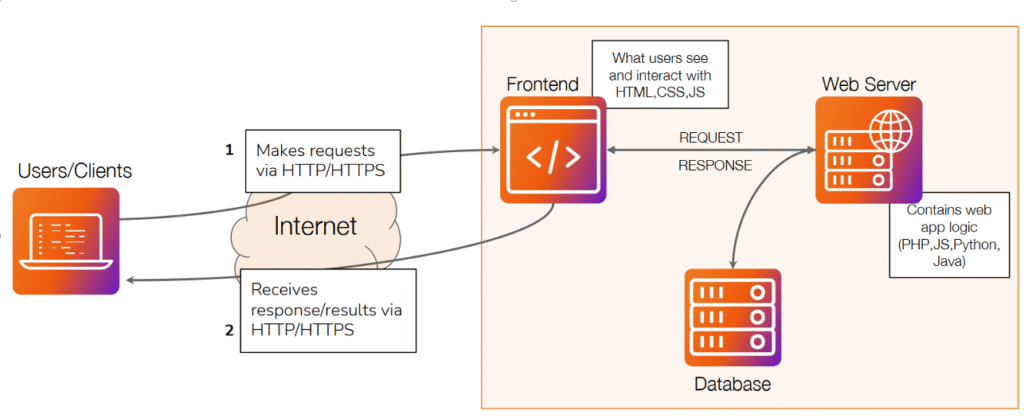 En términos más simples, una arquitectura de aplicación web es un marco estructural que determina la interacción entre diferentes componentes web (cliente y servidor). Define cómo interactúan las diferentes partes de la aplicación entre sí para ofrecer su funcionalidad, gestionar las solicitudes de los usuarios y administrar los datos. Una arquitectura de aplicación web bien diseñada es crucial para garantizar la escalabilidad, la facilidad de mantenimiento y la seguridad. Antes de realizar una evaluación de seguridad en una aplicación web, es de vital importancia saber cómo funcionan las aplicaciones web con respecto a la arquitectura subyacente. Este conocimiento le proporcionará una mejor comprensión de dónde y cómo identificar y explotar posibles vulnerabilidades o configuraciones incorrectas en las aplicaciones web.