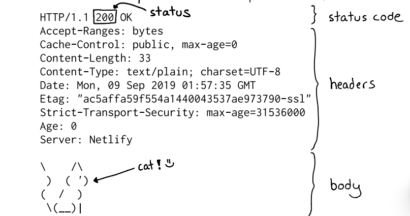 La imagen muestra una respuesta HTTP completa desglosada en sus partes esenciales: la status line en la parte superior (HTTP/1.1 200 OK), seguida de varios encabezados (headers) que describen metadatos sobre la respuesta, y finalmente el cuerpo (body) con el contenido real (en la ilustración un pequeño ASCII-art de un gato). Visualmente se enfatiza que el número de estado (200) indica éxito, que los headers comunican información sobre caché, tipo de contenido, longitud y seguridad, y que el body es lo que el cliente realmente consume una vez procesada la respuesta.