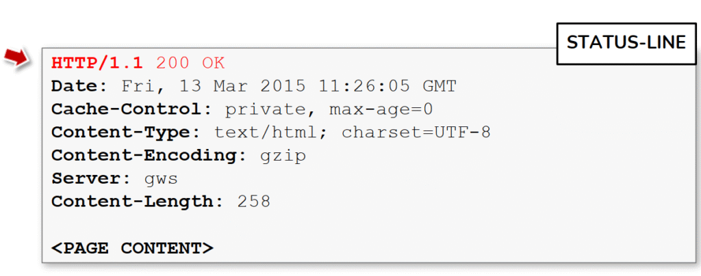 La primera línea de una respuesta HTTP es la línea de estado, que consta de la versión del protocolo (HTTP 1.1) seguida del código de estado HTTP (200) y su significado textual relativo (OK). La imagen enseña la anatomía de una respuesta HTTP y sirve como mapa para auditar comportamientos y malas configuraciones: entender qué significa cada encabezado y cómo influye en la seguridad y operativa es una habilidad básica y muy práctica para cualquier pentester web.