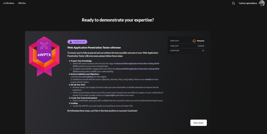 Esta no es una certificación menor solo superada por OSWE en su clase, existen pocas más por encima de esta (casi se resume a la OSCE3 y OSEE). Por supuesto abarcaremos todo el temario en este curso. La eWPTX (eLearnSecurity Web Pentest eXtreme) lleva todo lo aprendido a un nivel superior.