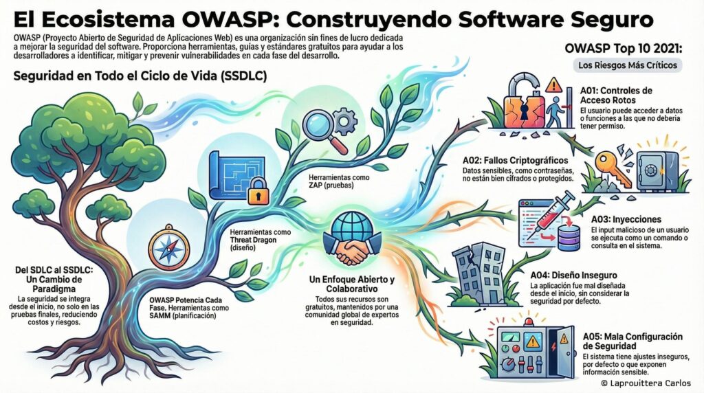 Cuando enseñás seguridad o cuando armás un equipo serio de desarrollo seguro, OWASP es el lenguaje común. Usás ASVS para definir requisitos, Proactive Controls para enseñar a programar bien, Top 10 para priorizar riesgos, WSTG para testear, SAMM para medir procesos, y herramientas como Dependency-Check para automatizar. Es un sistema completo, modular, escalable y, lo más importante, probado en el mundo real.
