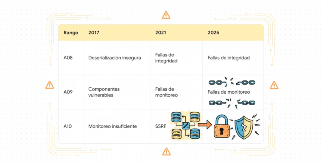 Además, SSRF fue absorbida por A01:2025 – Control de acceso deficiente.