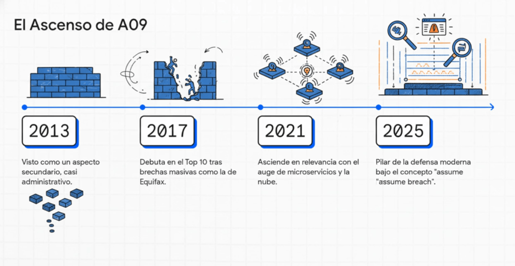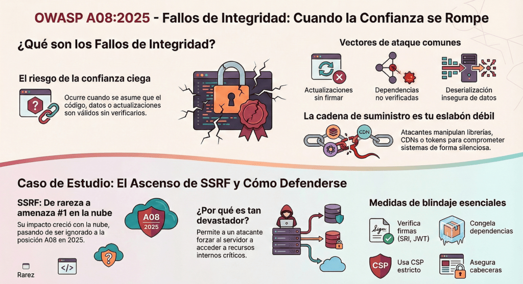 - A03:2025 expande “Componentes inseguros” a “Fallos en la cadena de suministro”.
