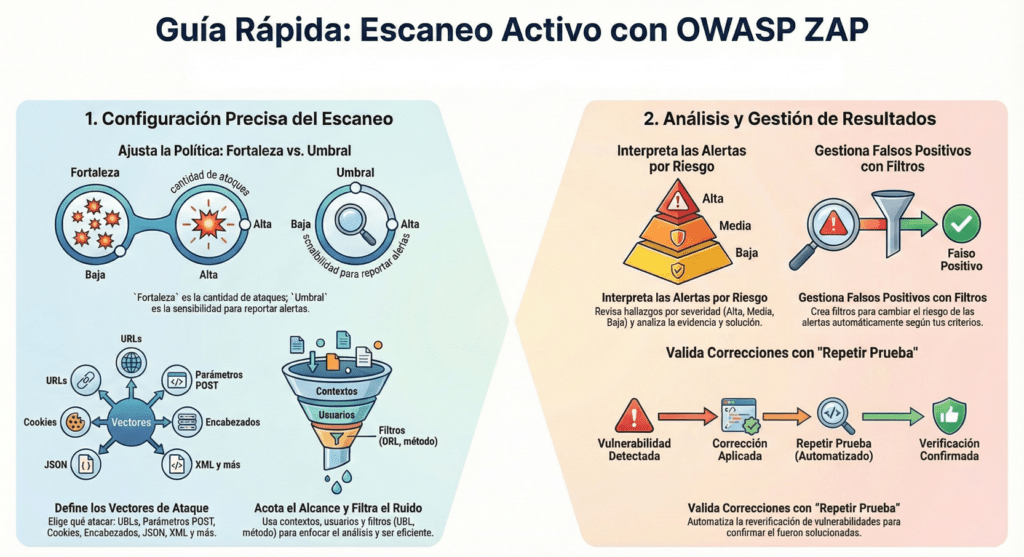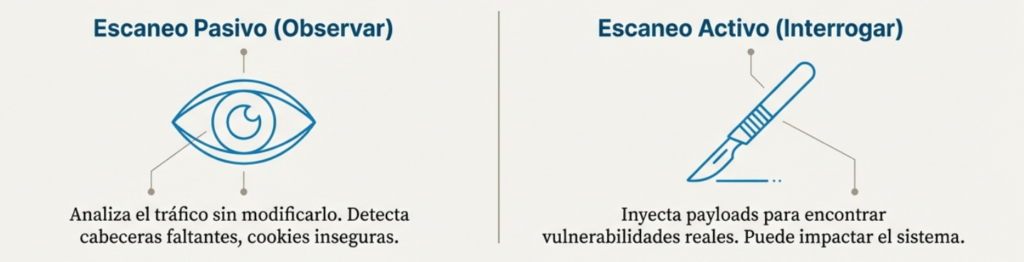 El escaneo activo inyecta payloads y altera peticiones para encontrar vulnerabilidades reales; a diferencia del pasivo, puede impactar el objetivo. Úsalo solo con autorización y mejor en preproducción.