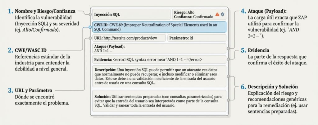 • Cada alerta muestra: riesgo, confianza, CWE/WASC, descripción, evidencia, payload y soluciones sugeridas (p. ej., SQLi → usar sentencias preparadas).