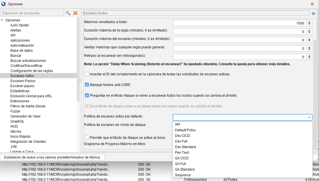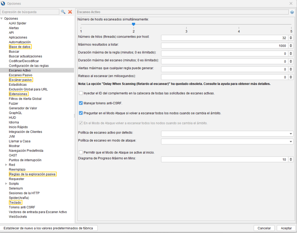 Concurrencia por host, hilos, top de resultados, tiempo máximo por regla y por escaneo, límite de alertas por regla, rate limiting, manejo de anti-CSRF, políticas por defecto y ventana del gráfico de progreso.