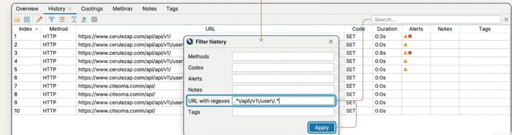 • Historial: listado secuencial con método, URL, código, duración, alertas, notas y etiquetas; soporta filtros avanzados (incluye regex).