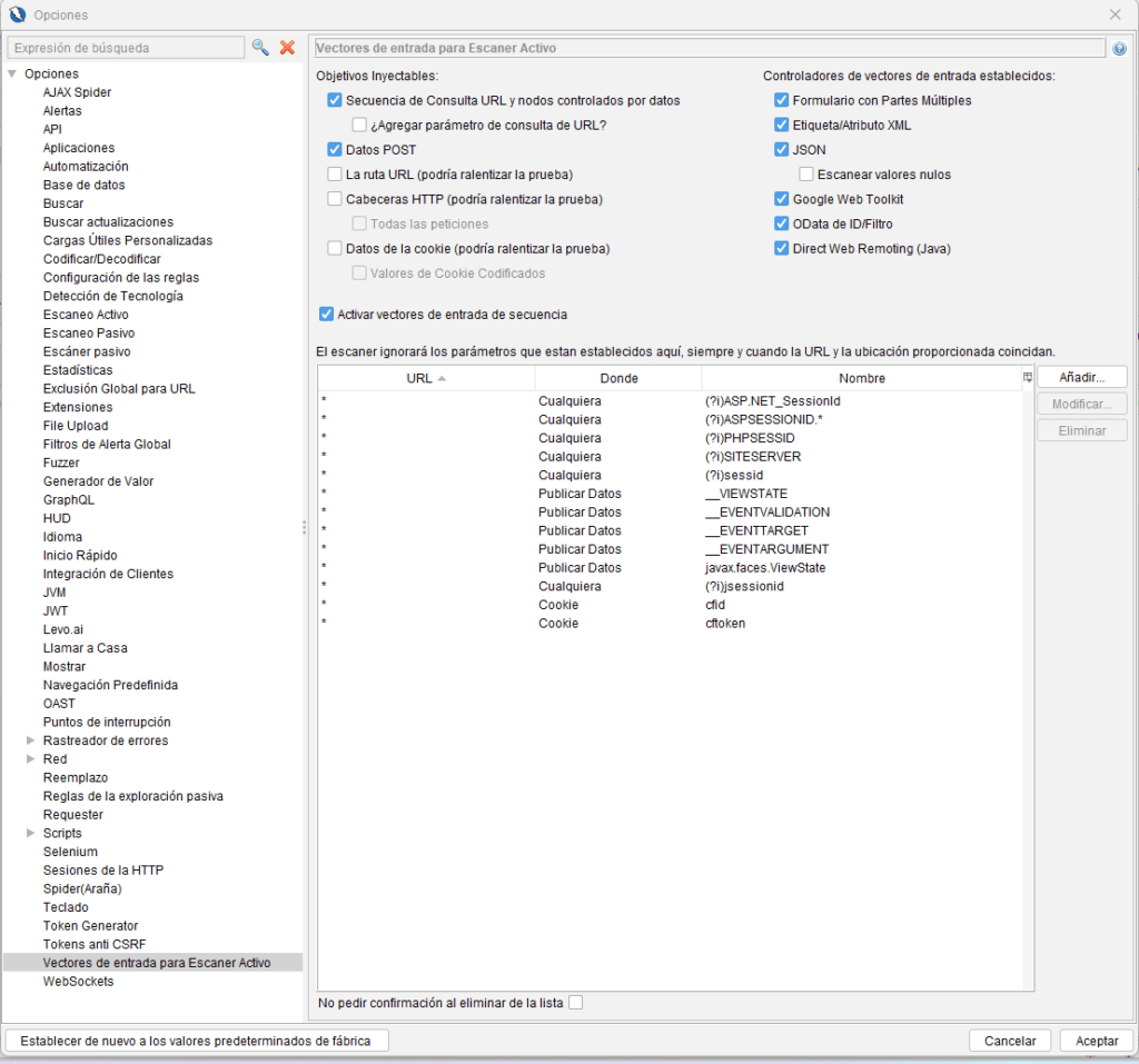 • Vectores de Entrada: Define dónde ZAP inyectará payloads. Desactiva los que no sean relevantes.
