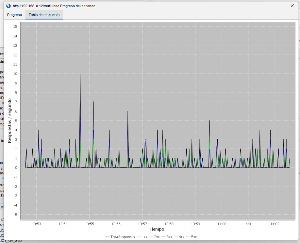• Gráfico de Respuestas: El electrocardiograma de tu objetivo. Visualiza la cantidad de respuestas por segundo, agrupadas por código de estado (lxx, 2xx, 3xx, 4xx, 5xx).