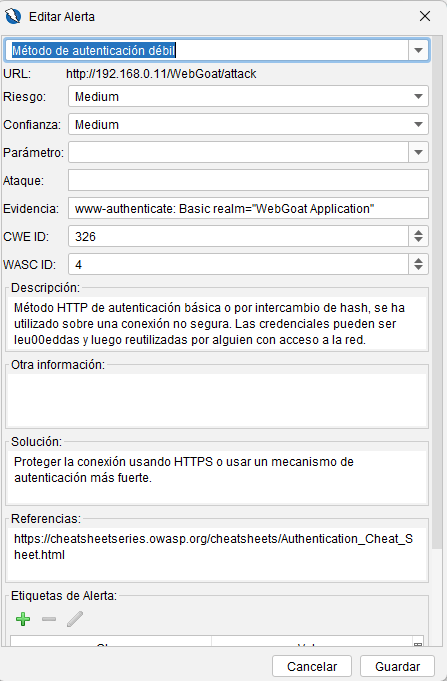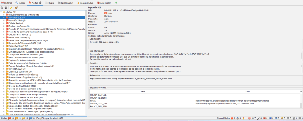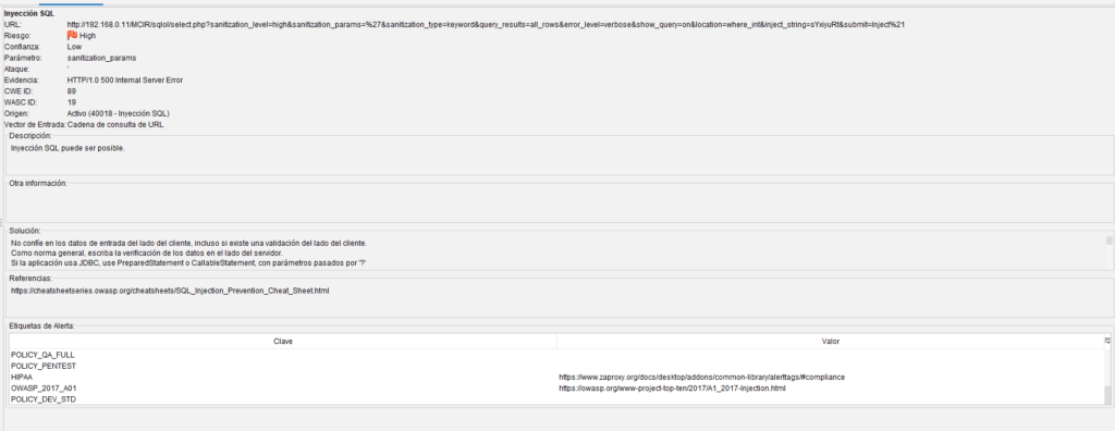 • Al hacer clic se muestra la URL, parámetro afectado, ataque utilizado, CWE/WASC, solución sugerida, etc.