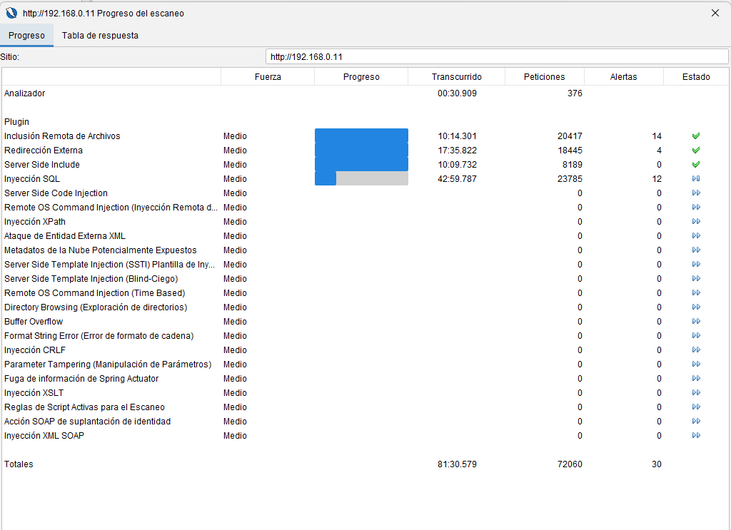 • Pestaña Escaneo activo: nuevo escaneo, pausar/reanudar, ver progreso, abrir Administrador de políticas y Progreso del análisis (detalles de reglas + gráfico por códigos 1xx–5xx).