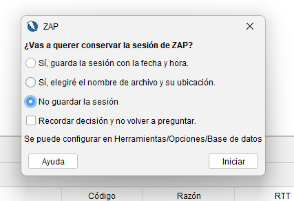 • No, no quiero persistir en esta sesión en este momento. Seleccione esta opción si no desea que ZAP guarde la sesión. Puede guardarla posteriormente con la opción «Persistir sesión… «.