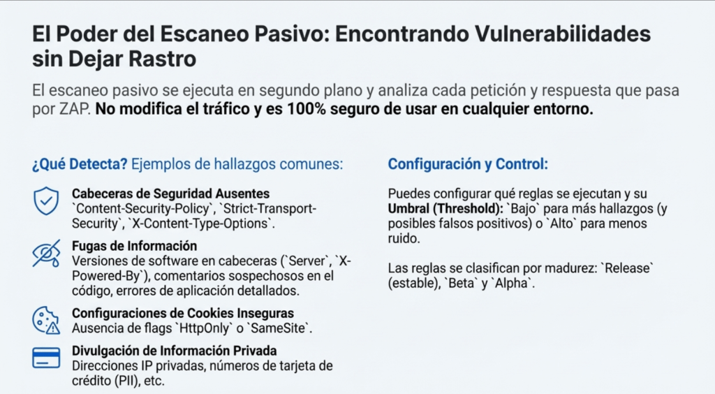 • Escaneo pasivo: analiza el tráfico que pasa por el proxy sin modificar nada. Es seguro y no invasivo.
