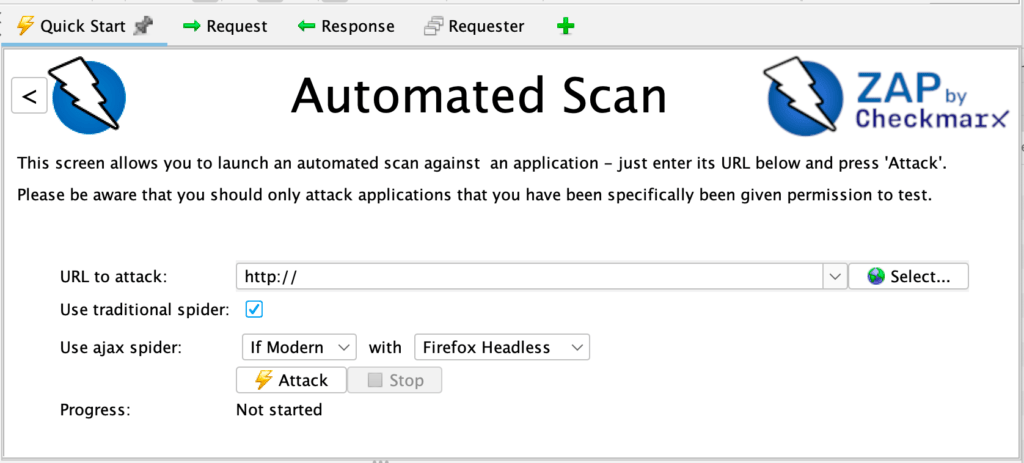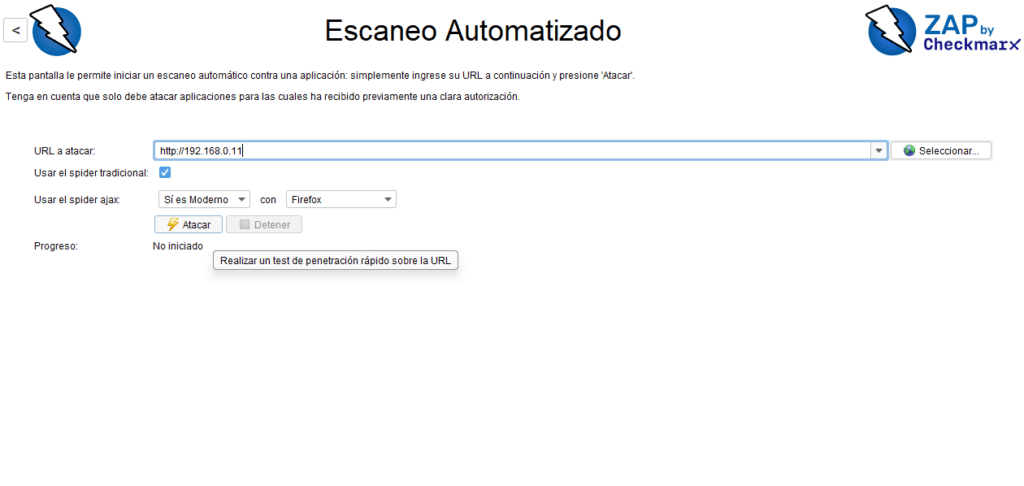 • URL para atacar Esta es la URL de la aplicación que desea atacar, que comienza con ‘http://’ o ‘https://’. ZAP debe poder acceder a esta URL para que el ataque continúe.