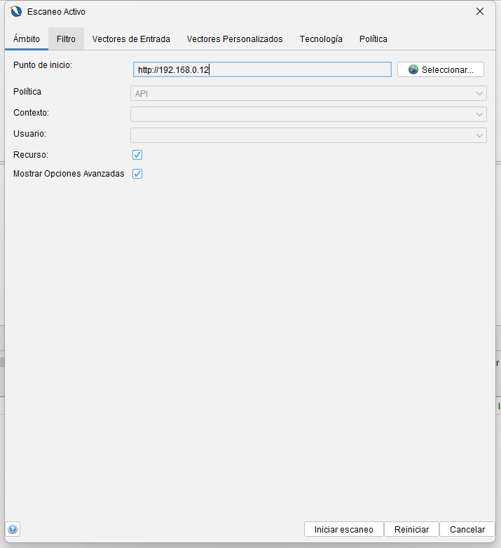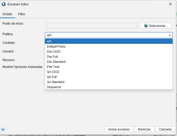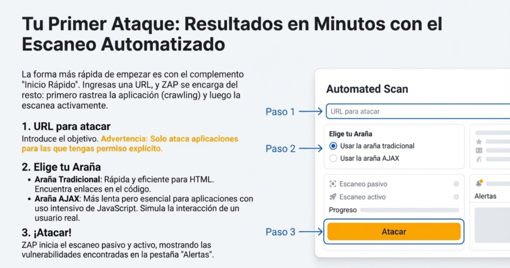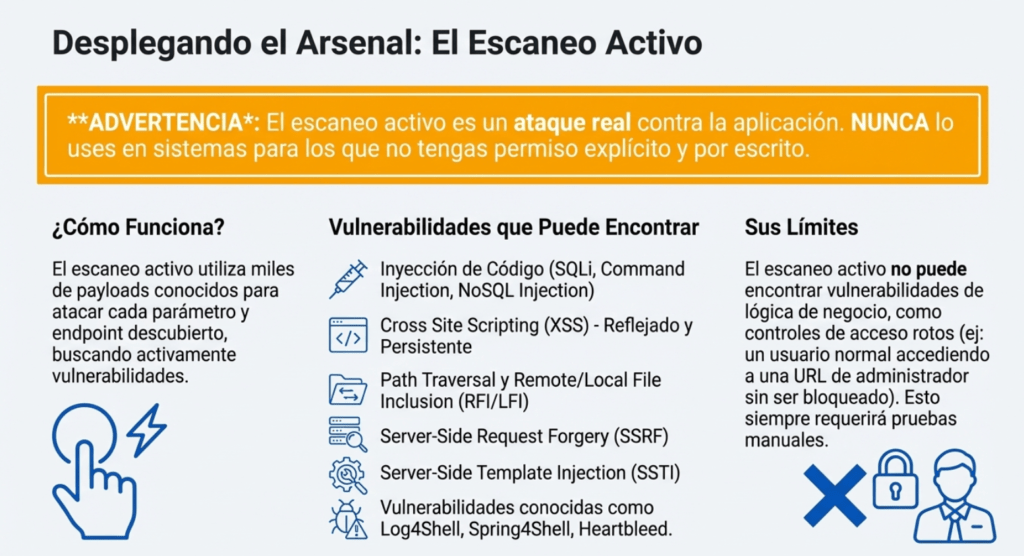 • Escaneo activo: lanza ataques automatizados (XSS, SQLi, etc.) para detectar vulnerabilidades reales. Puede ser destructivo si se usa en producción.