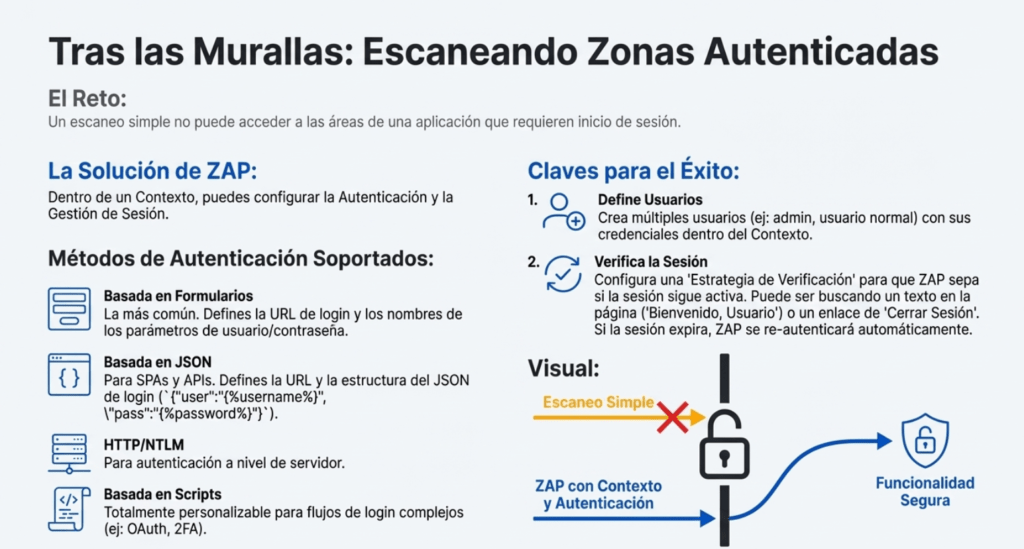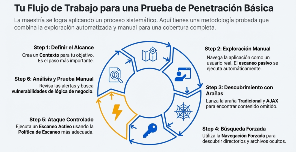 Has visto cómo transformar ZAP de un proxy a una plataforma de evaluación completa: exploración manual + automática, escaneo pasivo para reconocimiento seguro, y escaneo activo para encontrar problemas críticos — todo controlado por contextos, políticas y sesiones. Además, aprendiste a manejar autenticación y sesiones (clave para analizar áreas protegidas), a explotar Web paths ocultos con navegación forzada y a integrar ZAP en flujos automáticos (CI/CD).