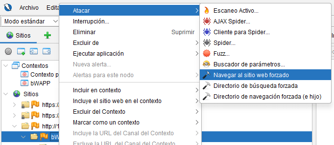 • Clic derecho en URL objetivo → Atacar → Navegación forzada.
