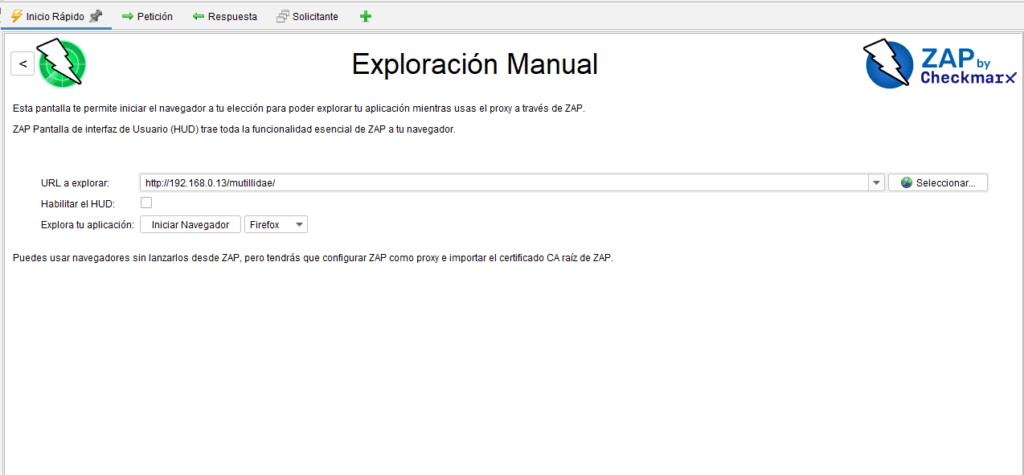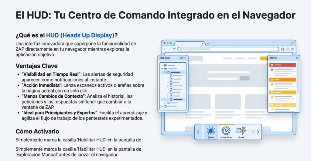 El HUD (Heads Up Display) es una interfaz gráfica integrada en el navegador que permite interactuar con ZAP directamente. Sus ventajas: