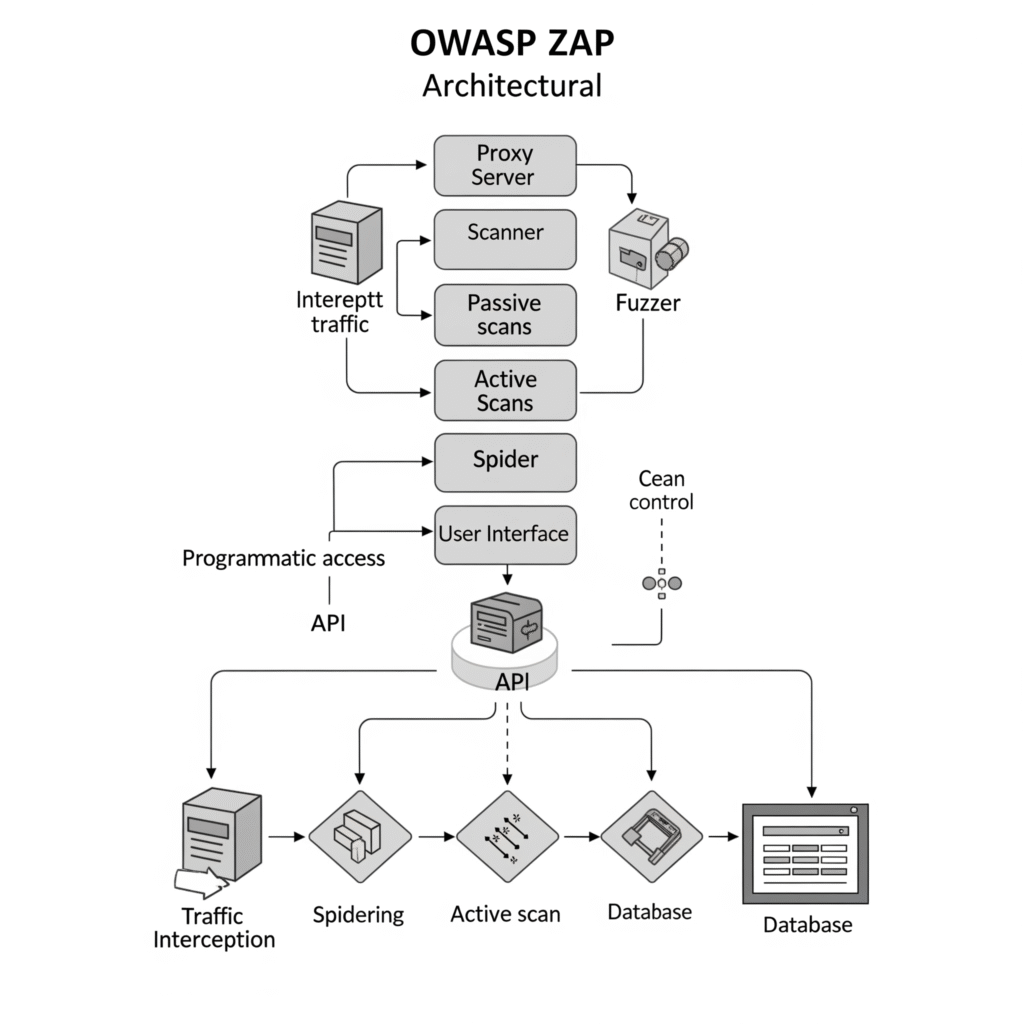 En la parte inferior del diagrama se muestra cómo, a través del API, se pueden ejecutar procesos específicos como Traffic Interception, Spidering, Active scan y la interacción con bases de datos internas donde ZAP registra resultados, configuraciones y hallazgos. A la derecha se ve un pequeño módulo de clean control, que sugiere funciones automatizadas para limpiar sesiones, eliminar datos temporales o reiniciar estados durante las pruebas. En conjunto, la imagen representa cómo OWASP ZAP organiza sus funciones de análisis, escaneo, interceptación y automatización.