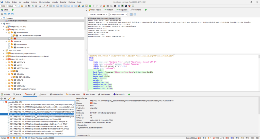 - En ZAP, verás el tráfico interceptado. El escaneo pasivo se ejecuta automáticamente y generará alertas sin enviar ataques.