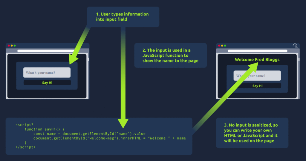 Cuando un usuario tiene control de cómo se muestra su entrada, puede enviar código HTML (o JavaScript) y el navegador lo usará en la página, lo que le permitirá controlar la apariencia y la funcionalidad de la página. La imagen de arriba muestra cómo un formulario envía texto a la página. Lo que el usuario introduce en el campo «¿Cuál es tu nombre?» se pasa a una función JavaScript y se muestra en la página. Esto significa que si el usuario añade su propio HTML o JavaScript en el campo, este se utiliza en la función «sayHi» y se añade a la página. Esto significa que puede añadir su propio HTML (como una etiqueta <h1>) y la entrada se mostrará como HTML puro.