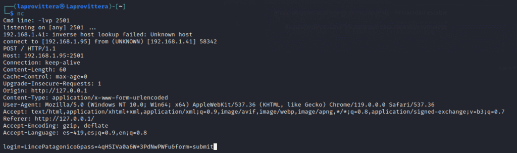 Cuando la víctima llena y envía el formulario, sus credenciales son enviadas al atacante.