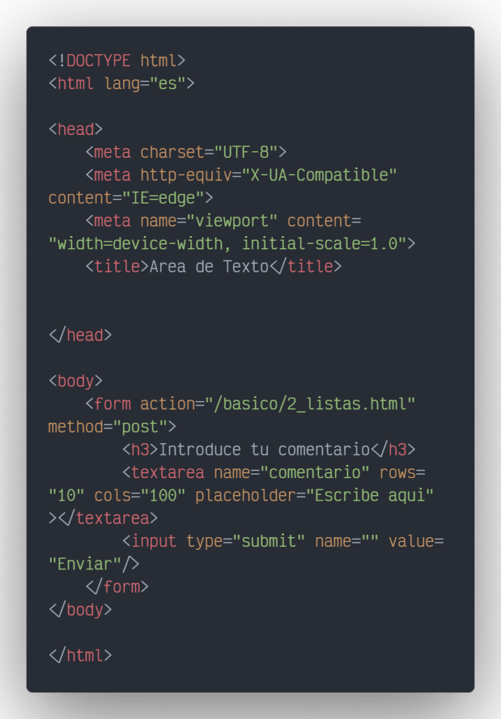 - <!DOCTYPE html> Define que la página es un documento HTML5. Esto facilita la estandarización en diferentes navegadores e indica al navegador que use HTML5 para interpretar la página.