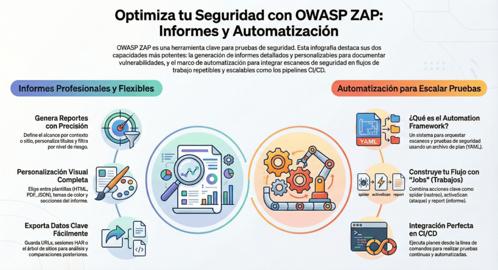 En este capítulo, Informes y Automatización en ZAP, vas a aprender cómo configurar y personalizar informes (ámbito, plantillas, secciones, temas y filtros), exportar e importar datos (HAR, URLs, árbol de sitios), y usar el Automation Framework para orquestar scans, spiders, pruebas, autenticación, retests y trabajos personalizados (activeScan, passiveScan, Spider, Ajax Spider, GraphQL, OpenAPI, SOAP, scripts, etc.).