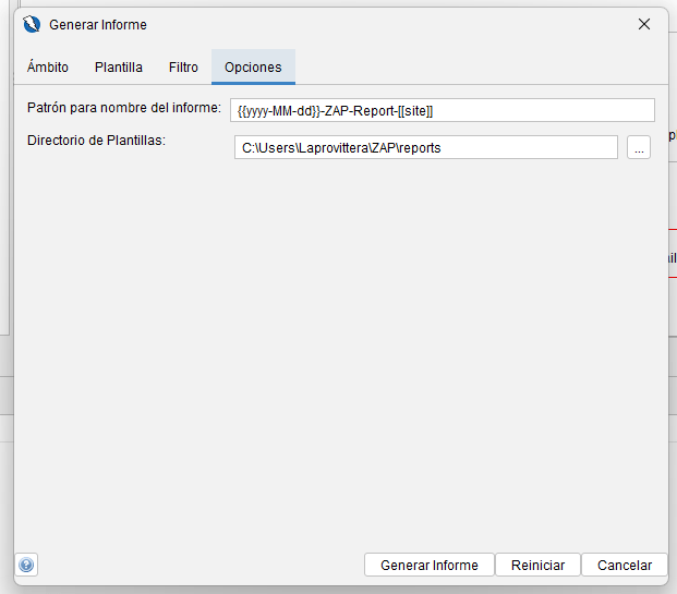 • Directorio de plantillas El directorio desde el que se cargarán las plantillas. Normalmente no debería ser necesario cambiarlo a menos que esté diseñando nuevos informes, en cuyo caso puede ser útil cambiar para que apunte a su directorio de informes de código fuente local. La carpeta «informes» en su directorio de inicio de ZAP se utiliza de forma predeterminada.