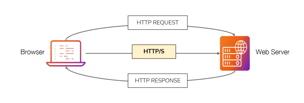 La imagen muestra de manera clara el proceso de comunicación entre un navegador (Browser) y un servidor web (Web Server) utilizando el protocolo HTTP o HTTPS. Este esquema es la base de cómo funcionan las páginas web en Internet y explica el intercambio de información entre el cliente y el servidor.