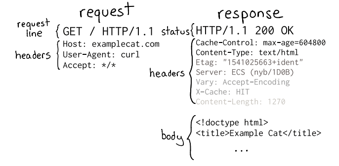 En la parte izquierda se muestra la request, que comienza con una línea de solicitud (request line). En este caso, el cliente realiza una petición GET a la raíz del sitio examplecat.com usando el protocolo HTTP/1.1. Debajo se incluyen los headers (encabezados), que aportan información adicional como el dominio del servidor (Host), el tipo de cliente que realiza la petición (User-Agent: curl) y el tipo de contenido que acepta (Accept: */*). Estos encabezados ayudan al servidor a interpretar correctamente la solicitud y preparar la respuesta adecuada.