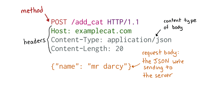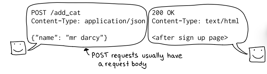 La imagen representa de forma esquemática una típica interacción HTTP donde el cliente envía una petición POST con un cuerpo en JSON y el servidor devuelve una respuesta HTML. A la izquierda se ve la request line POST /add_cat seguida del encabezado Content-Type: application/json y el body {«name»:»mr darcy»}. A la derecha aparece la respuesta 200 OK con Content-Type: text/html y el contenido de la página que se muestra después de registrarse o crear el recurso. Visualmente la ilustración subraya la regla práctica: las peticiones POST suelen llevar un cuerpo y obligan al servidor a parsearlo antes de actuar.