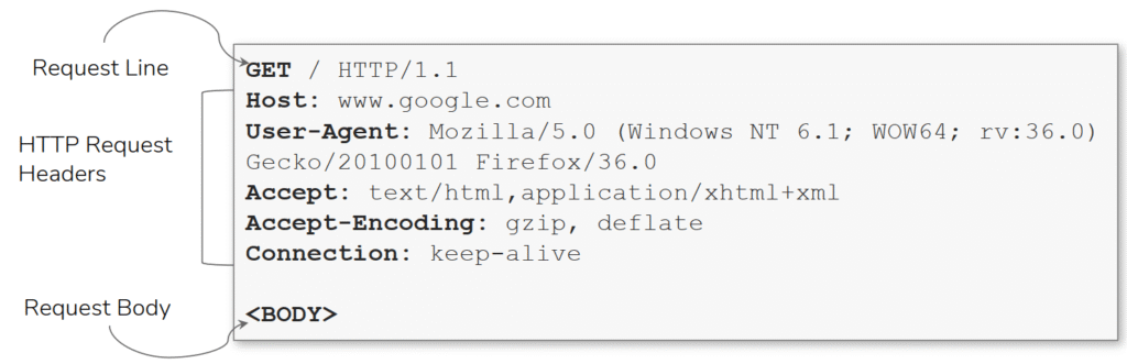 Una solicitud HTTP es lo que un usuario envía a un servidor web para interactuar con una aplicación web y lograr que algo suceda. Dado que estas solicitudes suelen ser el primer punto de contacto entre el usuario y el servidor web, comprender su funcionamiento es fundamental, especialmente si te dedicas a la ciberseguridad. Examinemos una solicitud HTTP en detalle. Los siguientes son los datos contenidos en una solicitud que enviamos cuando navegamos a www.google.com con un navegador web.