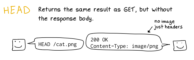 La imagen ilustra de forma sencilla el método HEAD: a la izquierda un cliente pide HEAD /cat.png y a la derecha el servidor responde 200 OK con el encabezado Content-Type: image/png, pero sin enviar el cuerpo (la imagen). Visualmente se enfatiza la diferencia clave frente a un GET: con HEAD se recibe únicamente la metadata (headers) que describen la respuesta, sin transferir el contenido binario.