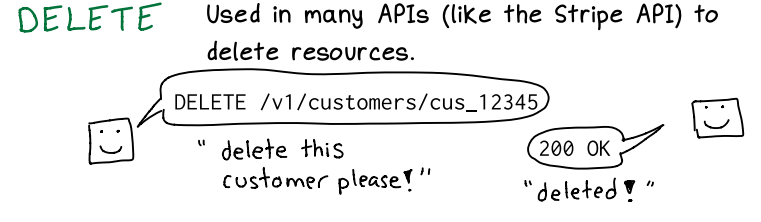 La imagen ilustra de forma muy simple el uso del método HTTP DELETE: un cliente envía una petición con la línea DELETE /v1/customers/cus_12345 pidiendo “eliminar este cliente” y el servidor responde con 200 OK confirmando la eliminación. Visualmente se enfoca en la semántica: DELETE se emplea para borrar recursos y en muchas APIs RESTful (por ejemplo Stripe u otras APIs públicas) suele mapearse a una acción irreversible o a una marca de eliminado sobre un recurso identificado por su ID.