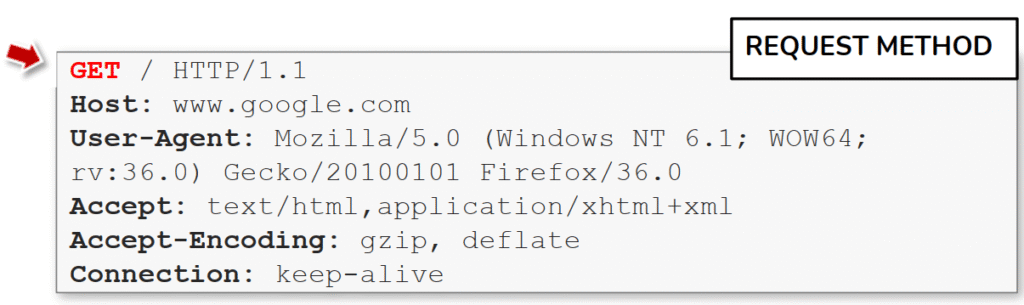 La imagen destaca de forma directa y visual la línea inicial de una petición HTTP —aquí GET / HTTP/1.1— y la sitúa como el elemento clave que indica la acción que pide el cliente (el método), el recurso solicitado (el path) y la versión del protocolo. Ese fragmento en rojo con la flecha señala que el método (GET) es lo primero que el servidor lee para decidir cómo procesar la petición; en contraste, métodos como POST, PUT o DELETE cambiarían tanto la semántica de la petición como la presencia esperada de un cuerpo (body).