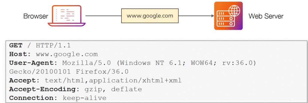 La imagen muestra una petición HTTP típica que un navegador envía a un servidor web —en este caso ilustrado hacia www.google.com— y desglosa la línea de solicitud seguida de varios encabezados HTTP. En la request line aparece GET / HTTP/1.1, que indica que el cliente solicita el recurso raíz / usando la versión HTTP/1.1; justo después se listan encabezados como Host, que especifica el dominio destino (www.google.com), y User-Agent, que identifica el software cliente (aquí un Firefox). Esto refleja el flujo habitual: el navegador resuelve el nombre, abre una conexión y envía esa petición al servidor correspondiente.